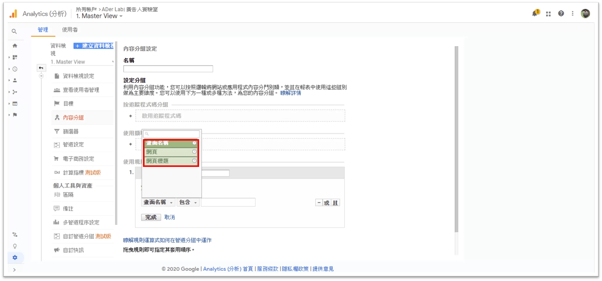 使用規則定義進行分組」的規則可以用「畫面名稱」、「網頁(URL)」以及「網頁標題」來設定內容分組規則。
