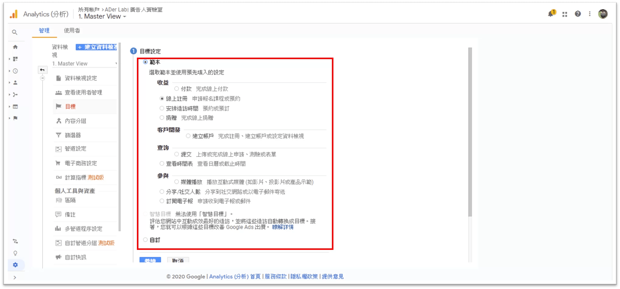Google Analytics 預設的目標像是線上註冊、預約、捐款、提交資料、訂閱電子報等等,如果這些預設的目標不符合你的需求,你也可以選擇「自訂」來自訂自己網站的目標。