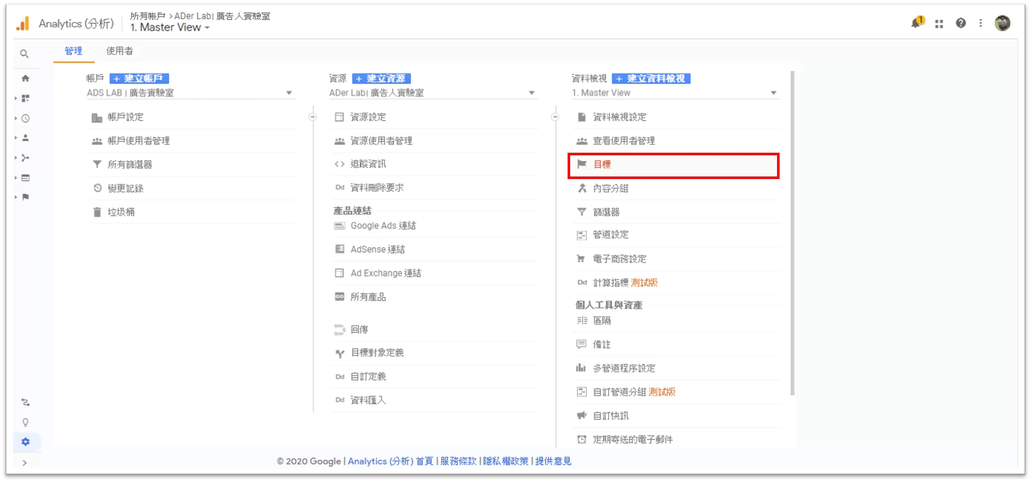 怎麼設定 Google Analytics目標?一樣是在 GA 帳戶右下角的「管理」,可以在資料檢視欄位下方找到「目標」。