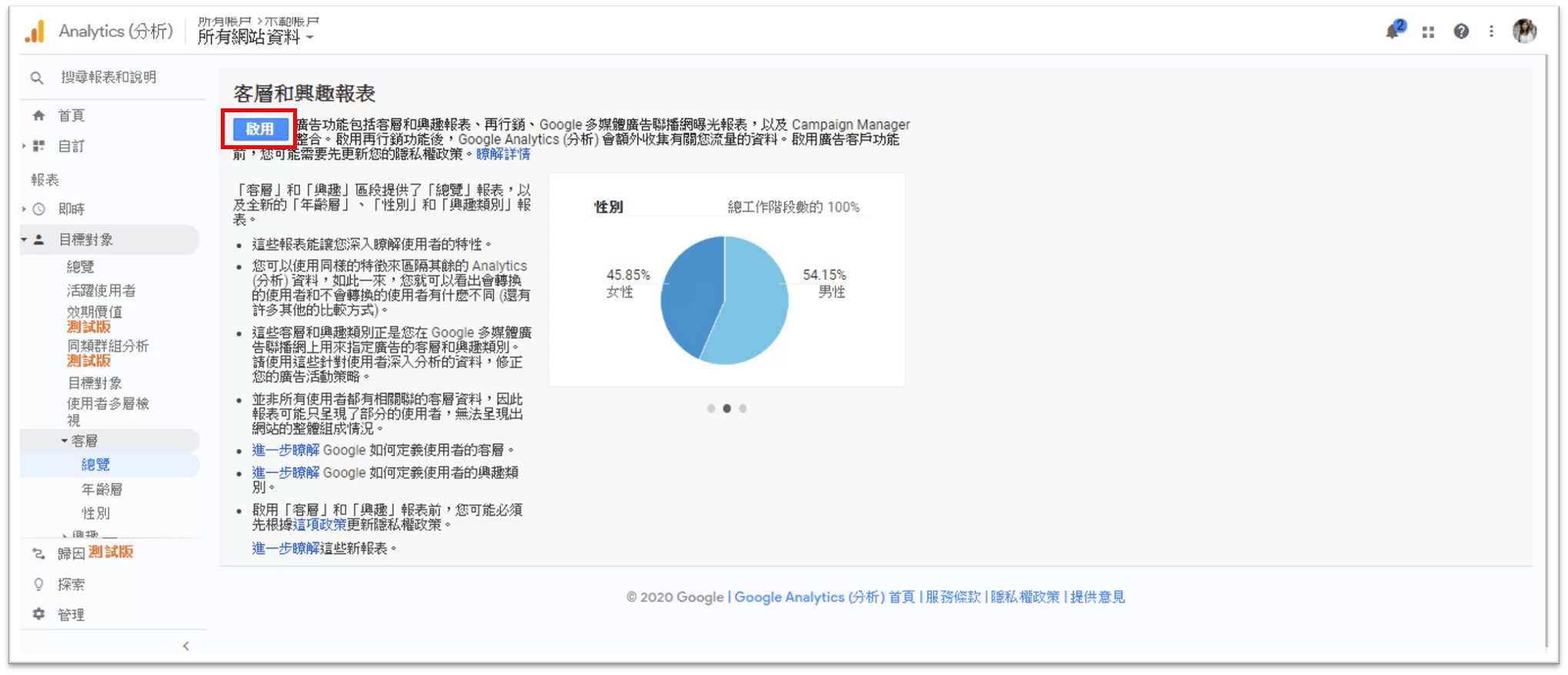 至於怎麼開啟客層與興趣報表?你可以點擊「目標對象」,選擇「客層」報表的總覽,就會看到可以「啟用」的選項,啟用之後就可開始追蹤網站的訪客輪廓了。