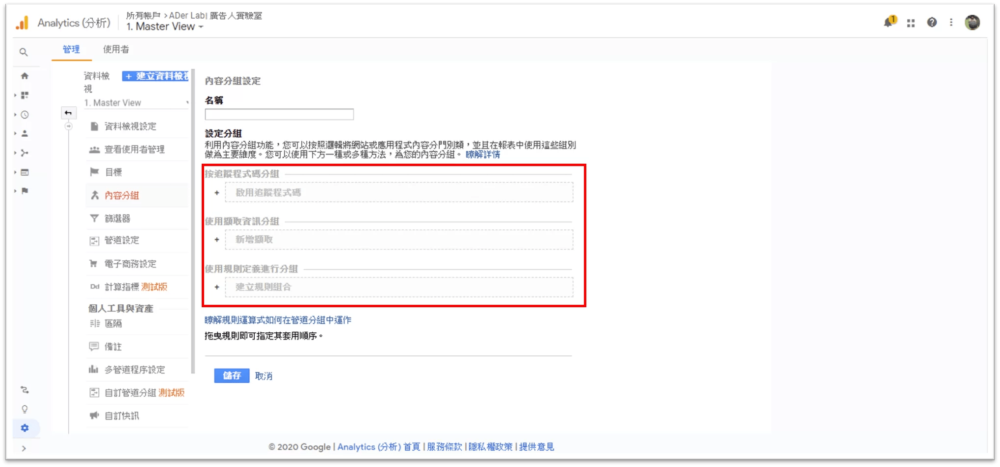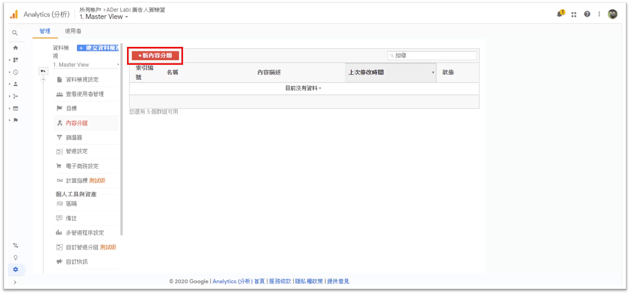 內容分組的設定一樣在 GA 帳戶的「管理」設定,可以找到「資料檢視」下方的「內容分組」,然後新增內容分組。