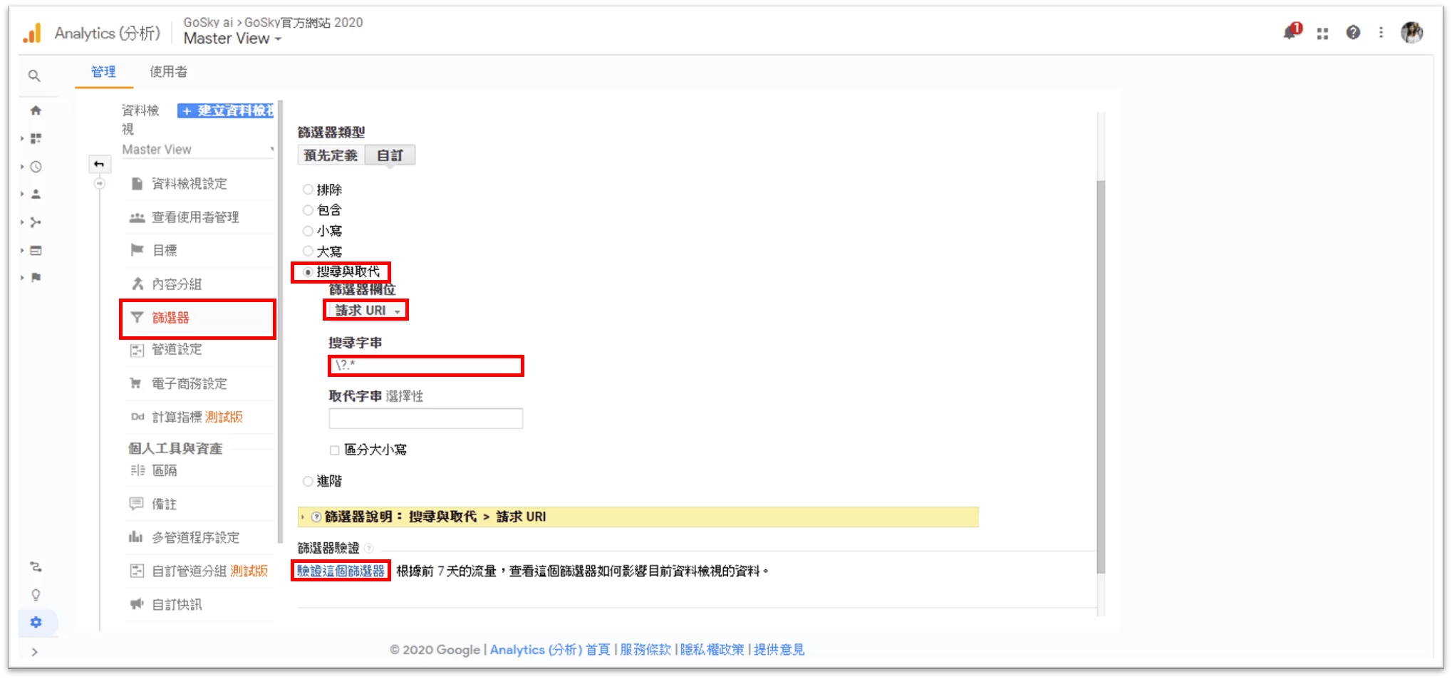 以下簡單以清除 WordPress 預覽畫面的網址,示範如何建立整理混亂網址的篩選器。首先打開 Google Analytics 的管理,然後再資料檢視的欄位下方找到篩選器,點開篩選器之後選擇「搜尋與取代」,然後選擇「請求 URL」,接著在搜尋字詞的地方輸入「\?.*」,因為篩選器的設定是會破壞原始資料,所以最後務必點選「驗證這個篩選器」,確保設定無誤再按下儲存即可。