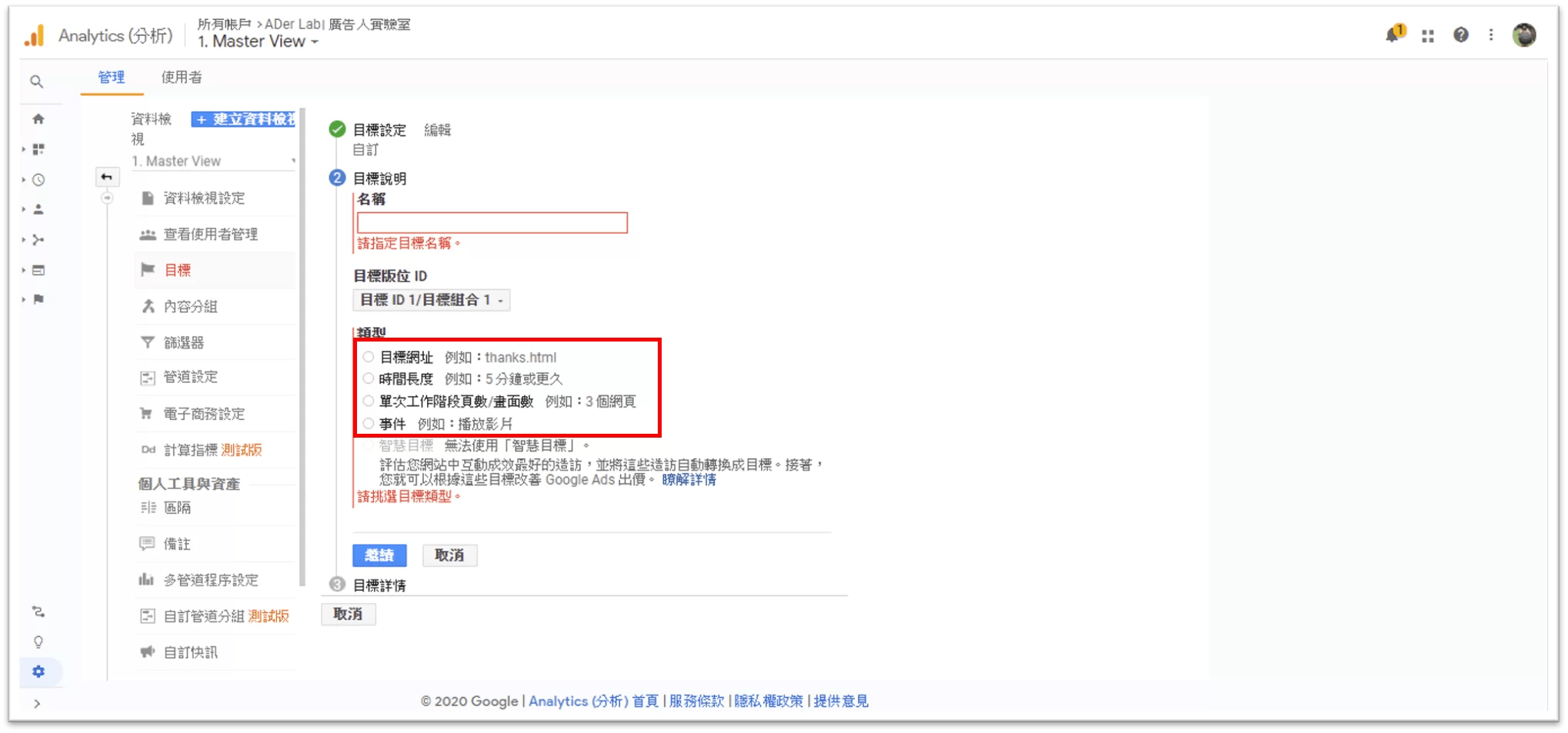 點選目標後就會進到設定目標的畫面,第一個要選擇的就是目標類型,目標類型選擇會影響後續的設定內容,所以如果目標不符合預設的目標,那就可以選擇「自訂」來規劃自己網站的目標。
