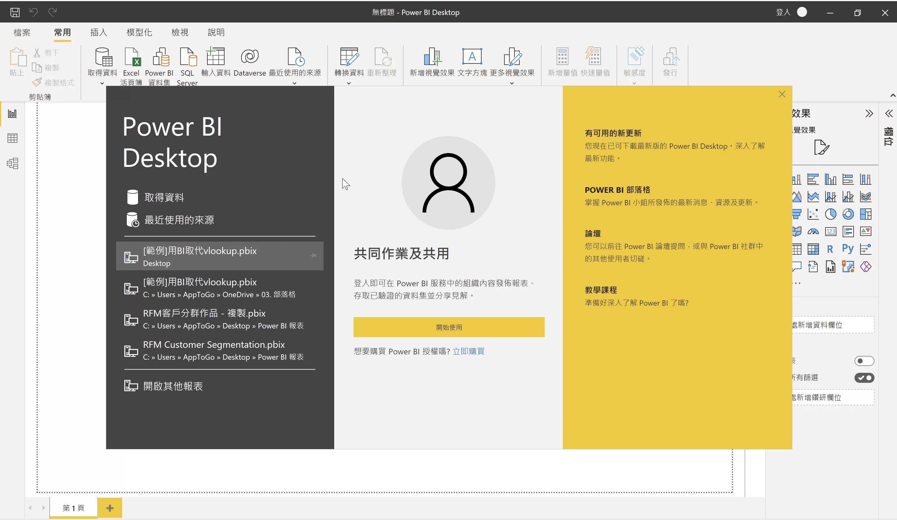 目前 Power BI 有提供免費的版本,只要到 Power BI 官方的網頁下載就可以使用囉,唯一的限制是,目前 Power BI 僅提供 Windows 作業系統使用,是目前比較可惜的部分。下載之後打開就會呈現如下圖的畫面。