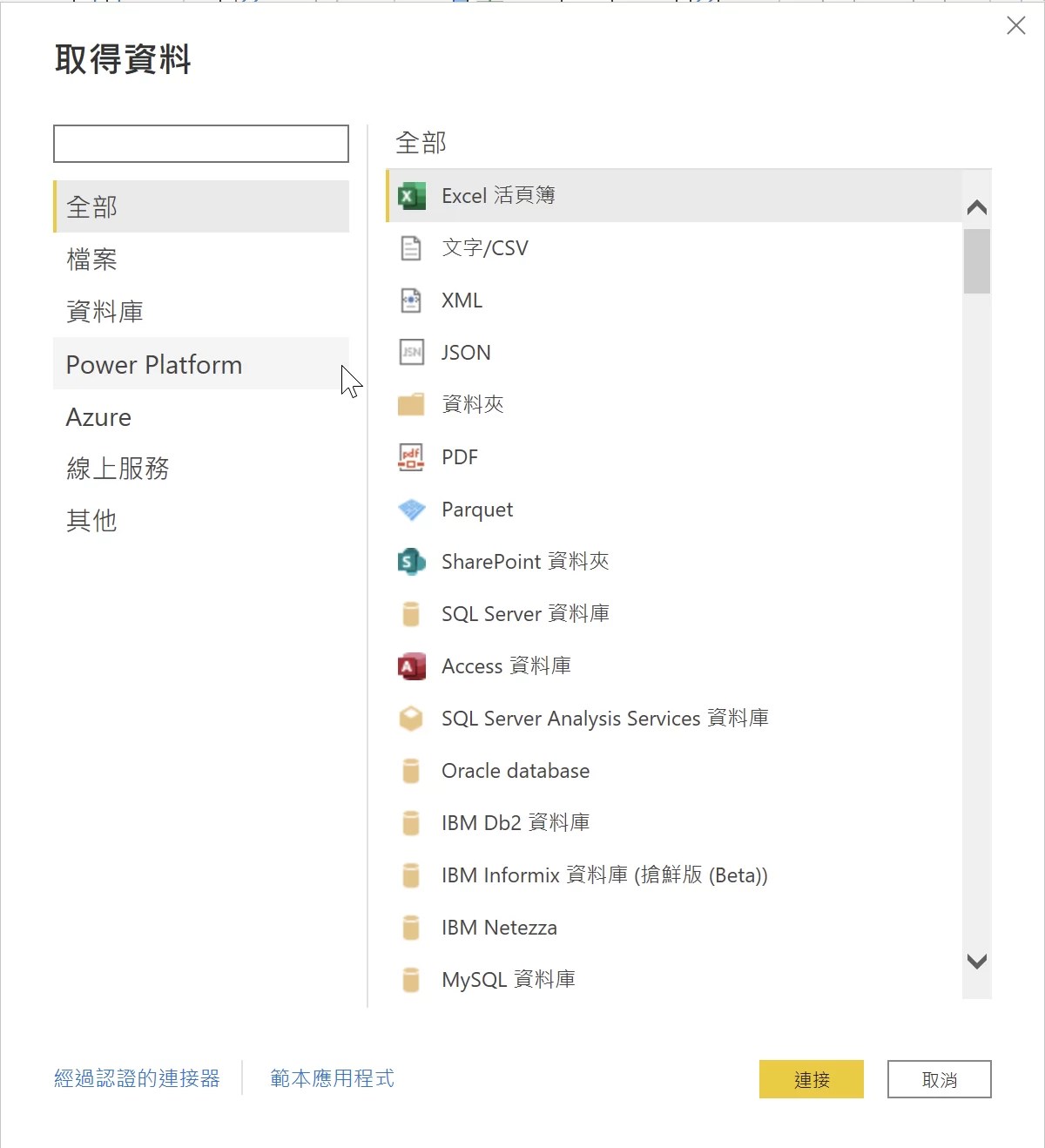 在第一個畫面上點擊「取得資料」,就可以挑選想要匯入的資料類型,這篇文章先以匯入Excel 資料為例。