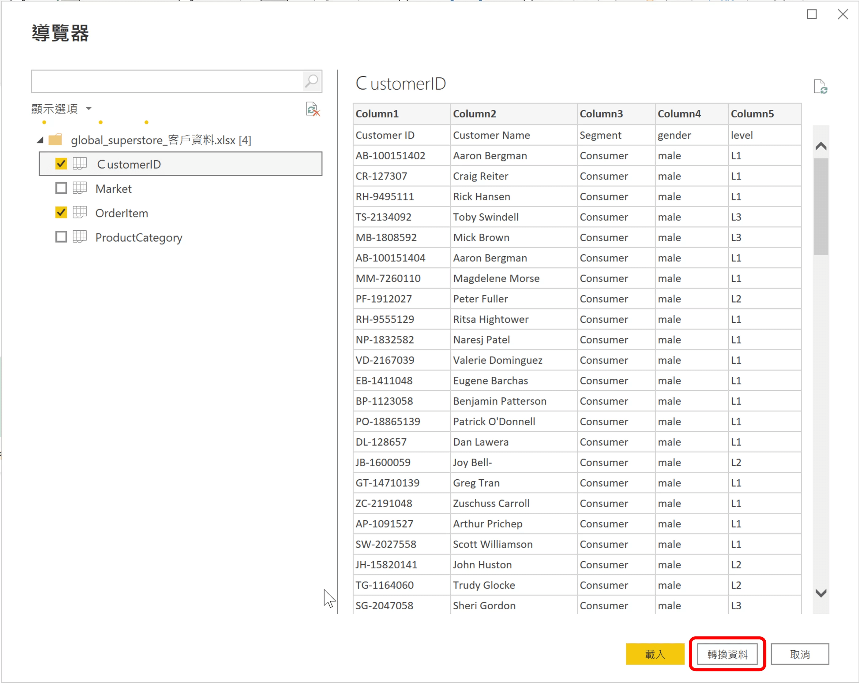 在這個步驟,我會建議在選擇好匯入的工作表資料後,不要直接點選「載入」,建議可以點選「轉換資料」,原因是因為資料常常會需要整理後才能使用,所以點選「轉換資料」的話就可以在資料匯入 Power BI 之前做資料處理跟檢查,例如說檢查有沒有缺漏值、缺漏值有多少比例,會不會影響到資料的可分析性,又或是將資料的欄位格式更改成對的格式,確保欄位讀取到正確的欄位名稱等,這是在做所有數據分析之前必備的檢查流程。