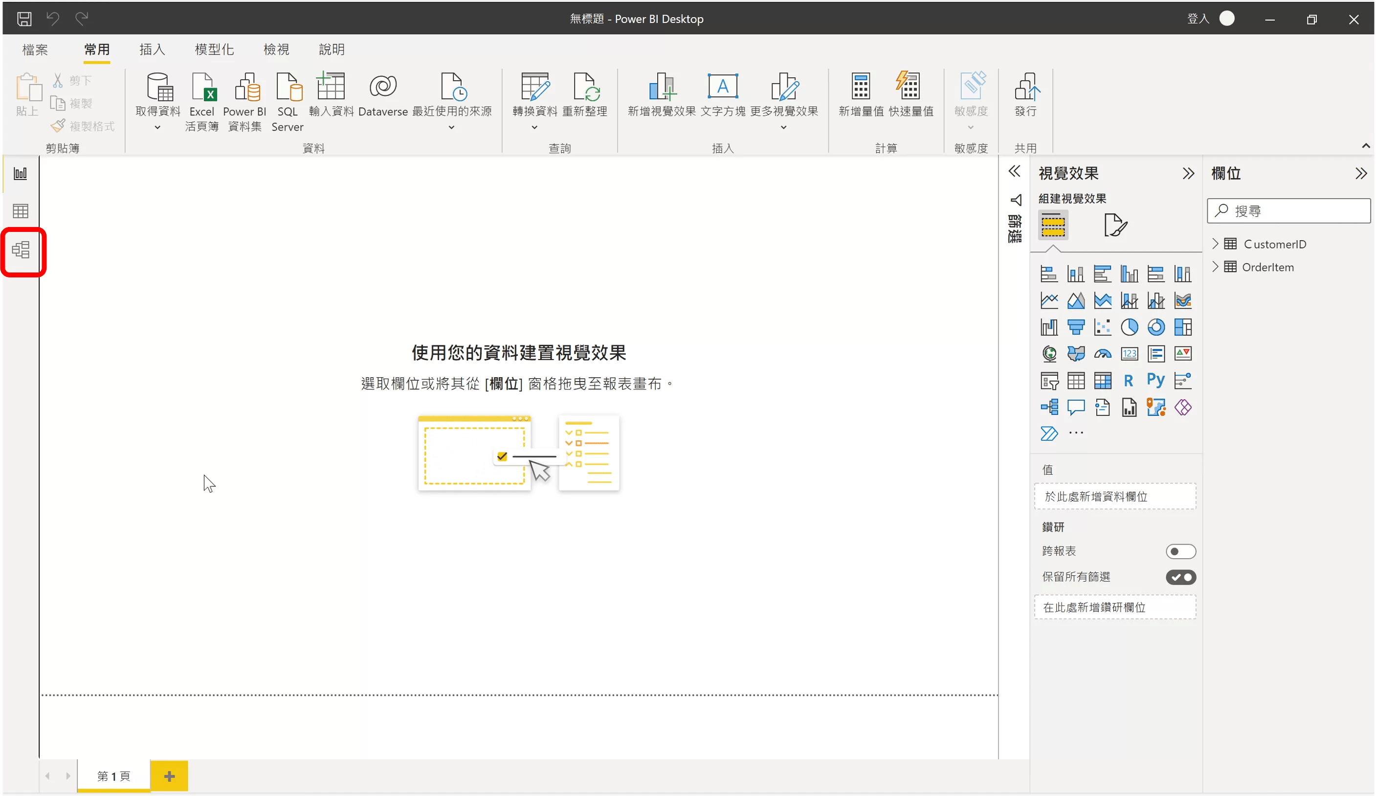 當資料匯入後,會先進入到一個空白的畫布,這個區塊就是讓我們可以任意拉報表與圖表的地方,但在拉報表前,要先確認我們需要使用到的資料有沒有做好了相關性連結。這時候需要點選左側欄的第三個小圖示「模型」。
