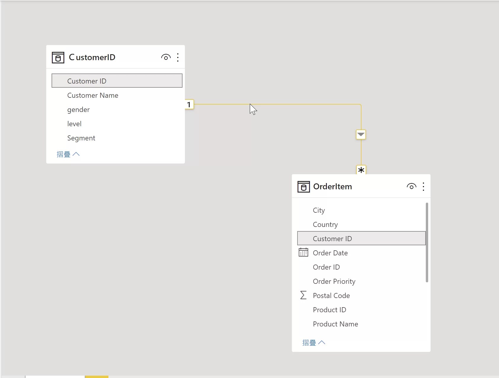 Power BI 非常智能,如果你匯入的資料的欄位名稱一樣,系統就會自動幫你做好資料連結,就像下圖一樣,我們需要做的就是檢查欄位連結有沒有錯誤就好。那遇到欄位名稱不一樣怎麼辦?例如說一份資料銷售日期可能是寫OrderDate,另外一份資料則是寫訂單成立日期,這也沒關係,我們只要手動拉取相關聯的資料欄位,用拖拉的方式進行資料連結即可。