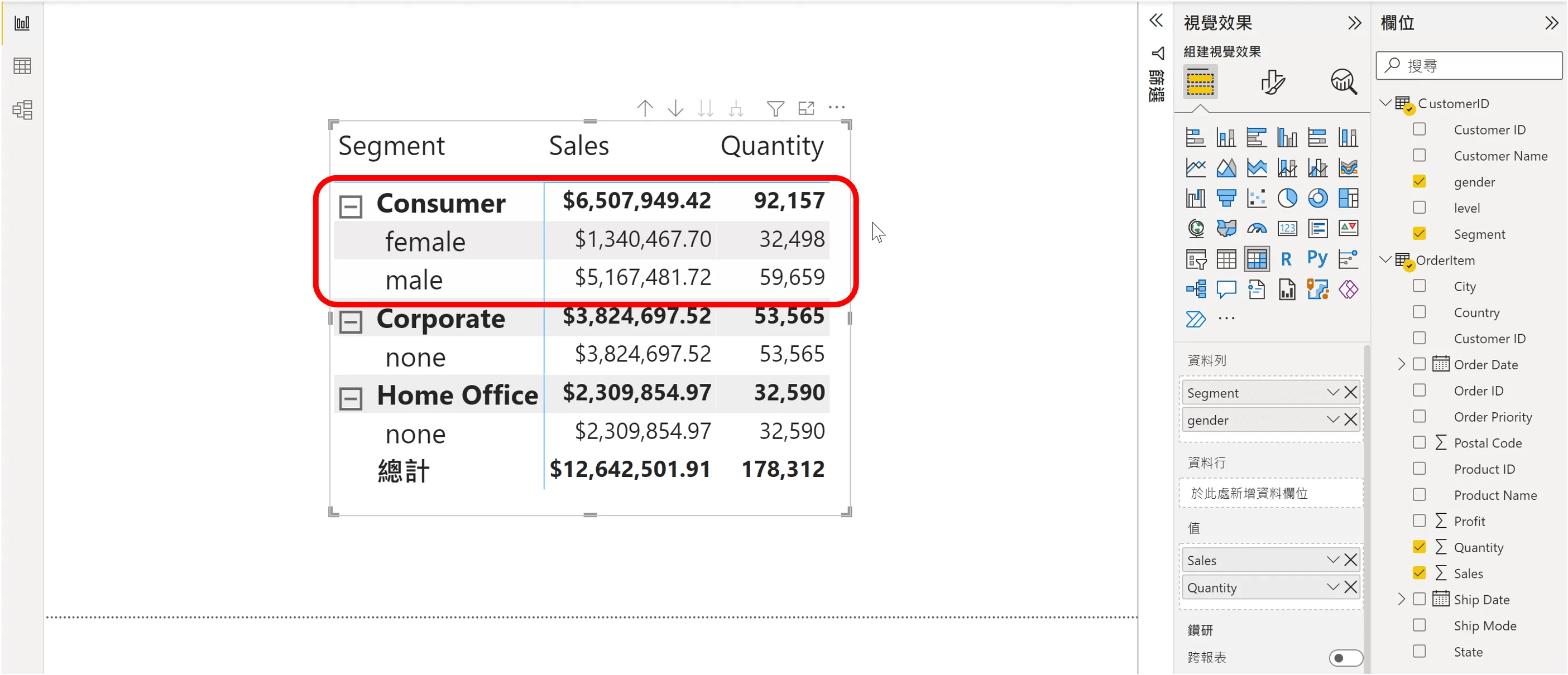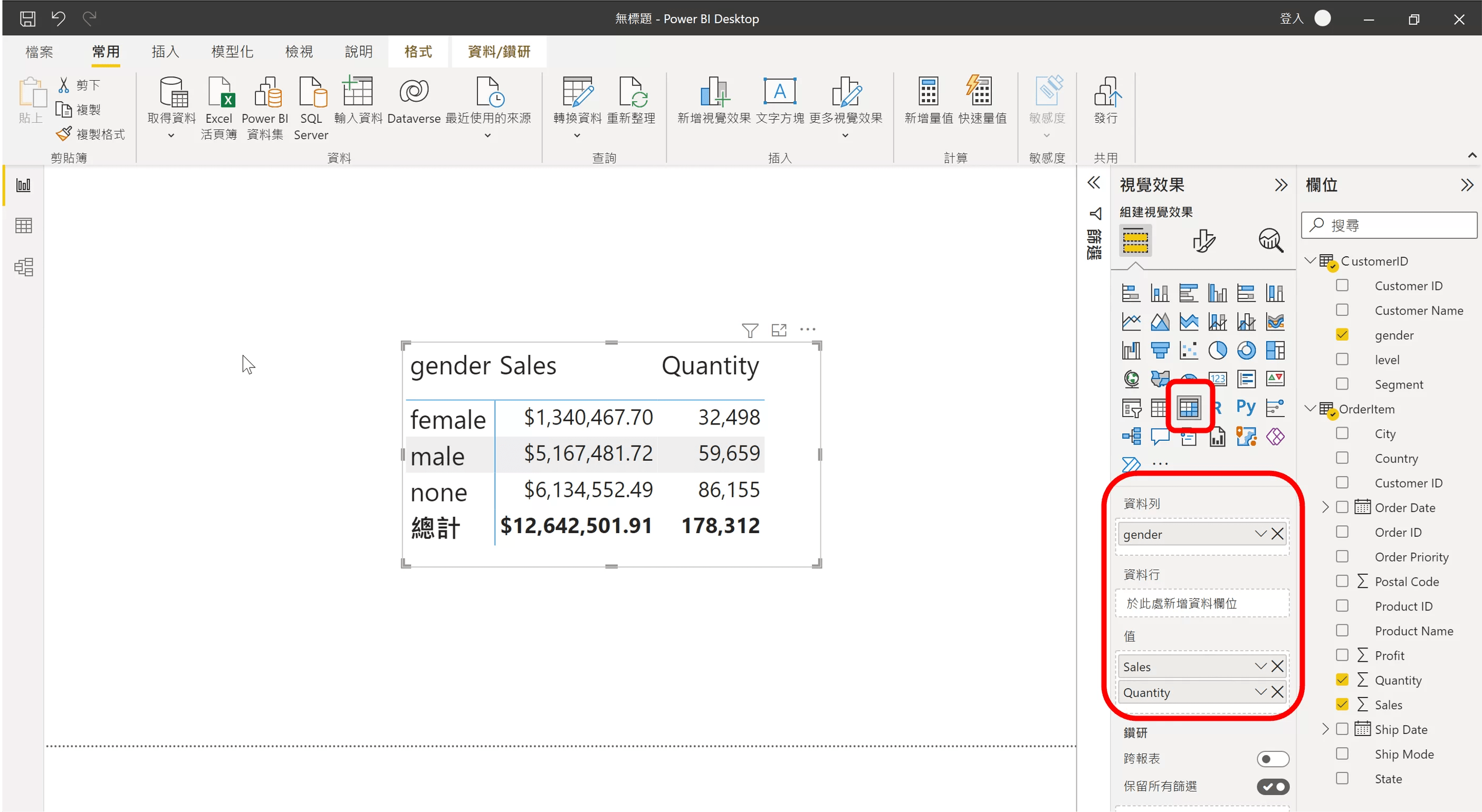 資料處理完也做完兩份資料的連結後,就可以開始建立我們想要分析的項目了。我先以常見的表格為例,如果我想知道現在消費客戶的性別組成,我就可以在CustomerID資料表拉取gender當作資料列,然後在值的地方放入Sales跟Quantity,簡單的性別貢獻度就出來了,就像是Excel的樞紐分析功能一樣,如下圖所示。