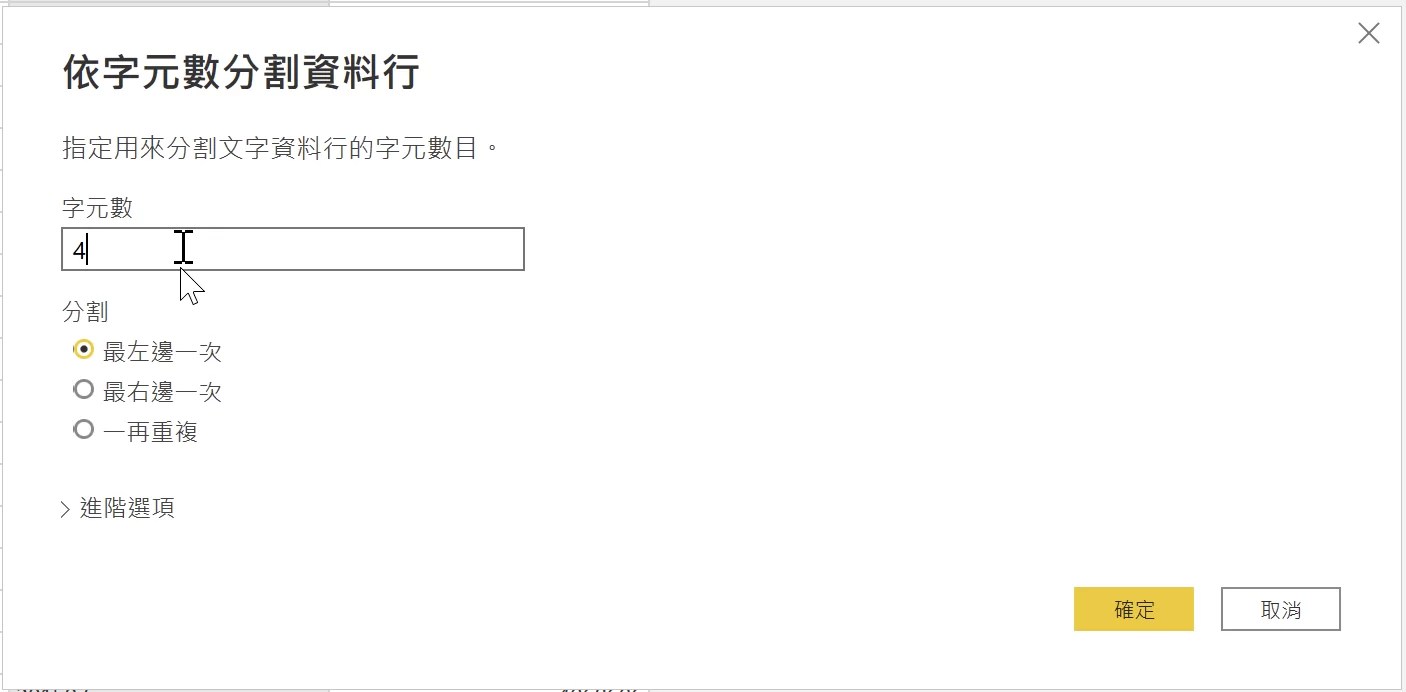如果是依字元數分割資料行的話,輸入想要分割的字元數即可,像是這份資料我們想把年份跟月份切分開來,所以字元數就輸入「4」。