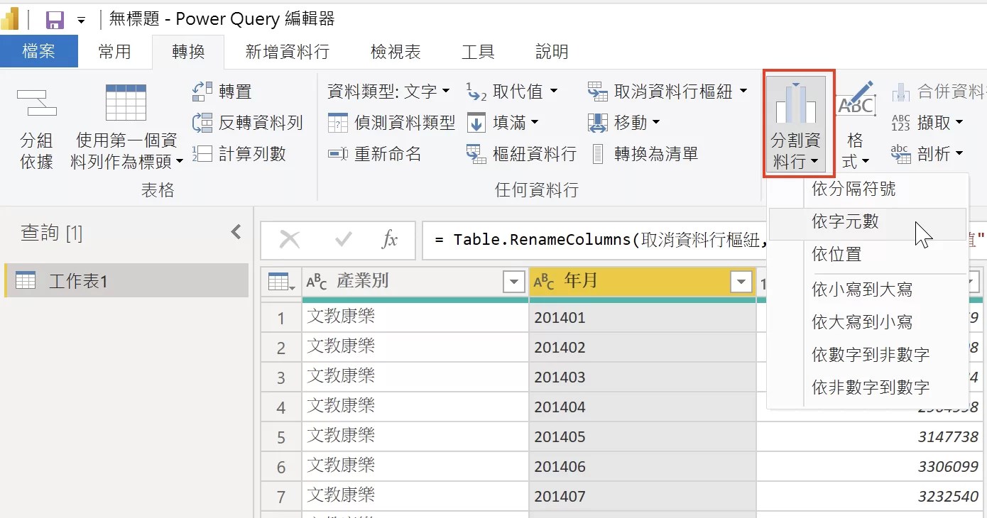 將工作列切換到「轉換」的工作區,點選「分割資料行」,分割資料行的方式有非常多種,以這份資料的資料數共6位數字,可以依「字元數」或是「依位置」分割。