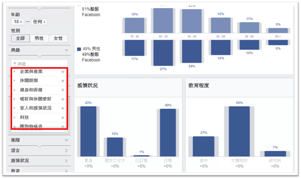 在人口統計資料的區塊,你也可以大致了解這群受眾的感情狀態,包括:單身、穩定交往中、已婚、已訂婚等;也可以大致了解受眾的教育程度。為什麼會說「大致」呢?是因為人口統計資料的來源是源自於每個用戶的基本資料設定,所以如果用戶沒設定就沒辦法辨別了。