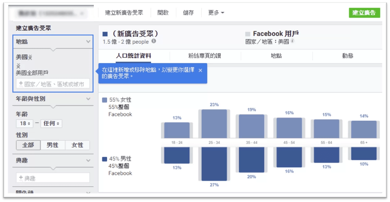 第二步則是開始能建立篩選條件,只留下你想觀察的對象特質,例如說可以設定對象的年齡區間、性別或是針對具有某種興趣的對象觀察。