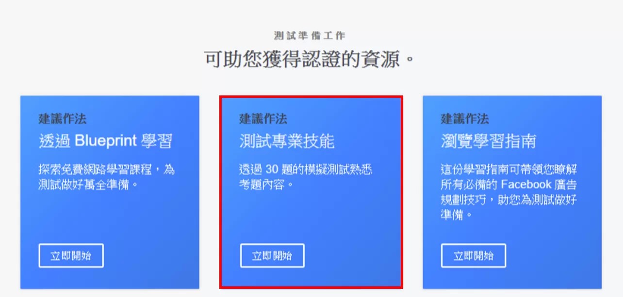 最後最後就是考試前兩週的牛刀小試啦!其實 Facebook Blueprint每個認證級別都有提供30題的模擬測驗,提供在每個級別詳細說明的頁面,如下圖所示。我在準備 媒體購買專家認證 時,除了做完媒體購買專家認證模擬測驗外,也把數位行銷專員認證的模擬試題、媒體企劃專家認證的模擬考題都一併測試了,透過這個過程發現一些自己的盲點和不熟的單元,是一個確認備試狀態以及熟悉度的好方法。