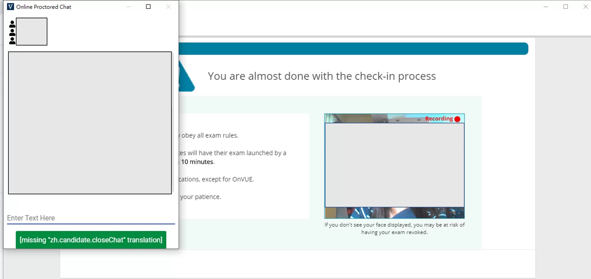 雖然試卷是中文題目與選項,不過監考人員會用英文訊息和英文與應試者確認考試內容與詢問是否有問題,這個流程如果沒問題監考人員就會協助將考試畫面呈現在應試者的螢幕上了,這個過程原本的應用程式頁面會不見,剎那間會像是網路斷網,但別擔心,大概 30秒到1分鐘左右開始考試的畫面就出來了。另外,考試畫面的右上方有個兩個 icon,可以開起來看剩餘時間和作答題數,比較不會有無法掌握時間的徬徨感。
