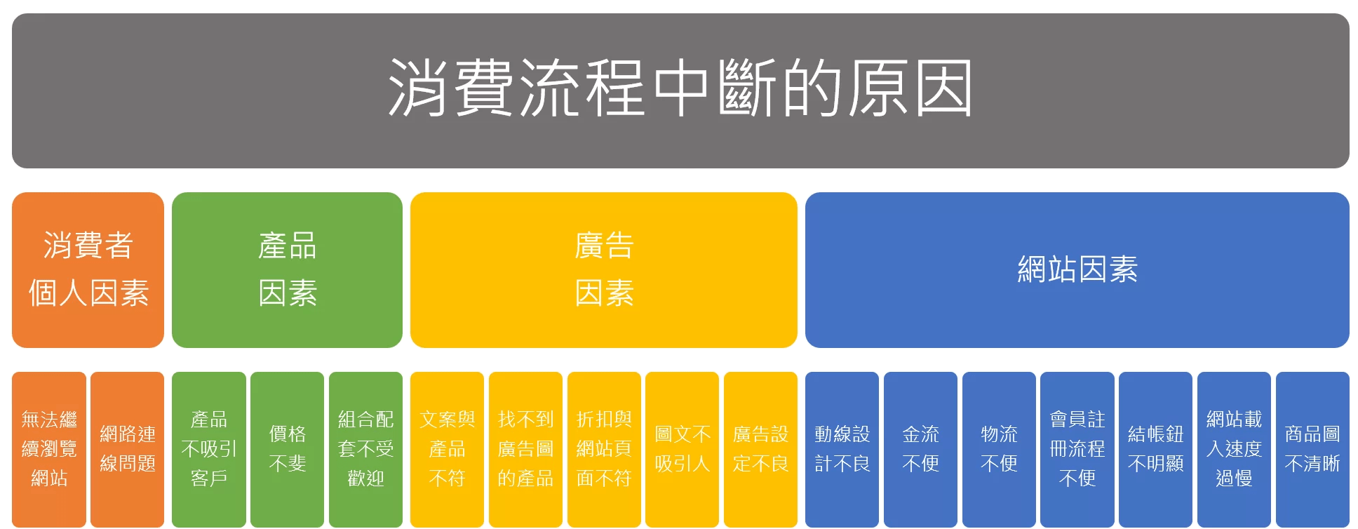 以消費者不買單的問題來看,造成消費者進入網站不購物的原因很多,像是廣告文案與商品實際的介紹不吻合,可能宣傳的優惠沒有顯示在網頁上,又或是會員註冊手續太繁瑣,付款方式不方便、運費太貴、沒有合適的送貨選擇等。每個環節都可能流失客戶,而廣告能做的就是帶進客戶而已,但若是沒有協助客戶注意結帳流程的種種細節,就很容易讓廣告辛辛苦苦帶進的流量白白流失。